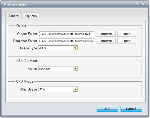 As you can see, you can set and change the output folder and snapshot folder by clicking the “Browse” button. Also you are allowed to choose the default format to save the image. Moreover, you can decide what the software do after conversion and the CPU usage rate. All these settings can be saved for later use.